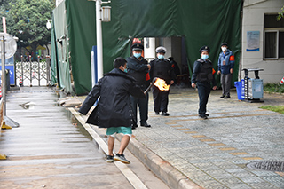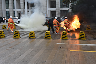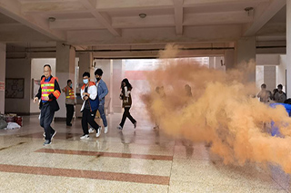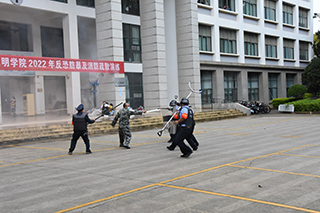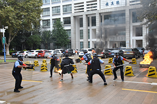 演练现场,各处置组迅速到位,应急处置中队队员持防暴盾牌、防暴叉对暴恐分子形成合围并采取强制措施将其制服,灭火组进行火点扑救,医疗救护组抢救受伤学生,博文楼学生在老师组织下迅速从火场疏散到安全区域,演练顺利结束。