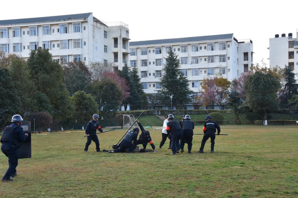 10时30分演练开始。2名校外男子偷偷混进校园,在足球场搭讪女同学,搭讪不成对女生进行胁迫,女同学在呼救同时报警校园110。接报警后,驻校保安大队应急中队携带装备迅速赶到现场,先期到场安保队员在确保女同学安全的同时震慑“歹徒”,应急中队到达现场对“嫌疑人”劝解无效后应急队员持防爆装备将迅速控制。昌宏路派出所民警及时赶到现场,保卫处将“2名嫌疑人”移交给公安机关,演练顺利完成。