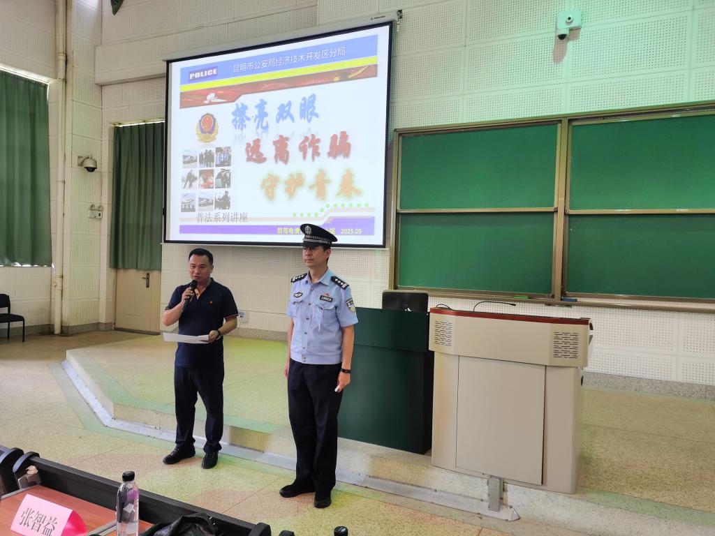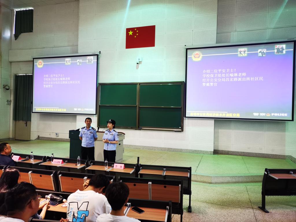 6月27日下午,应保卫处邀请昆明市公安局经开分局执法监督大队教导员闫文赋、昌宏路派出所社区民警戴岍岭到校为医学院150余名同学进行专题反诈宣传教育讲座,保卫处副处长张智益等四人参加活动。