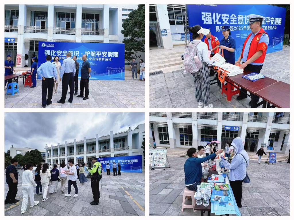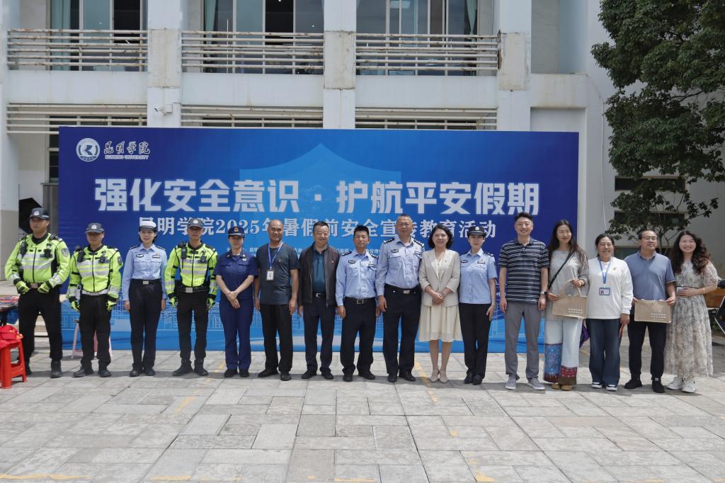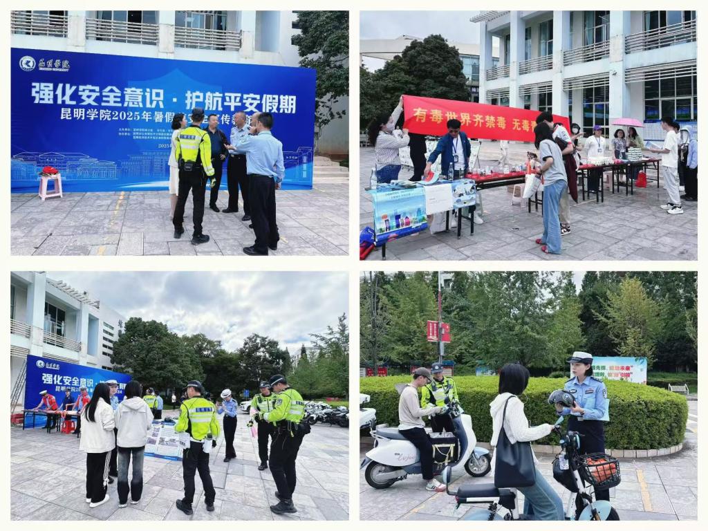 7月8日上午,保卫处、学生处、后勤管理中心联合昆明市公安局交通管理支队七大队、经开区消防救援大队、经开公安分局昌宏路派出所、阿拉街道办事处及云知社区,在澄明苑食堂前举办昆明学院“强化安全意识·护航平安假期”2025年暑假前安全宣传教育活动。